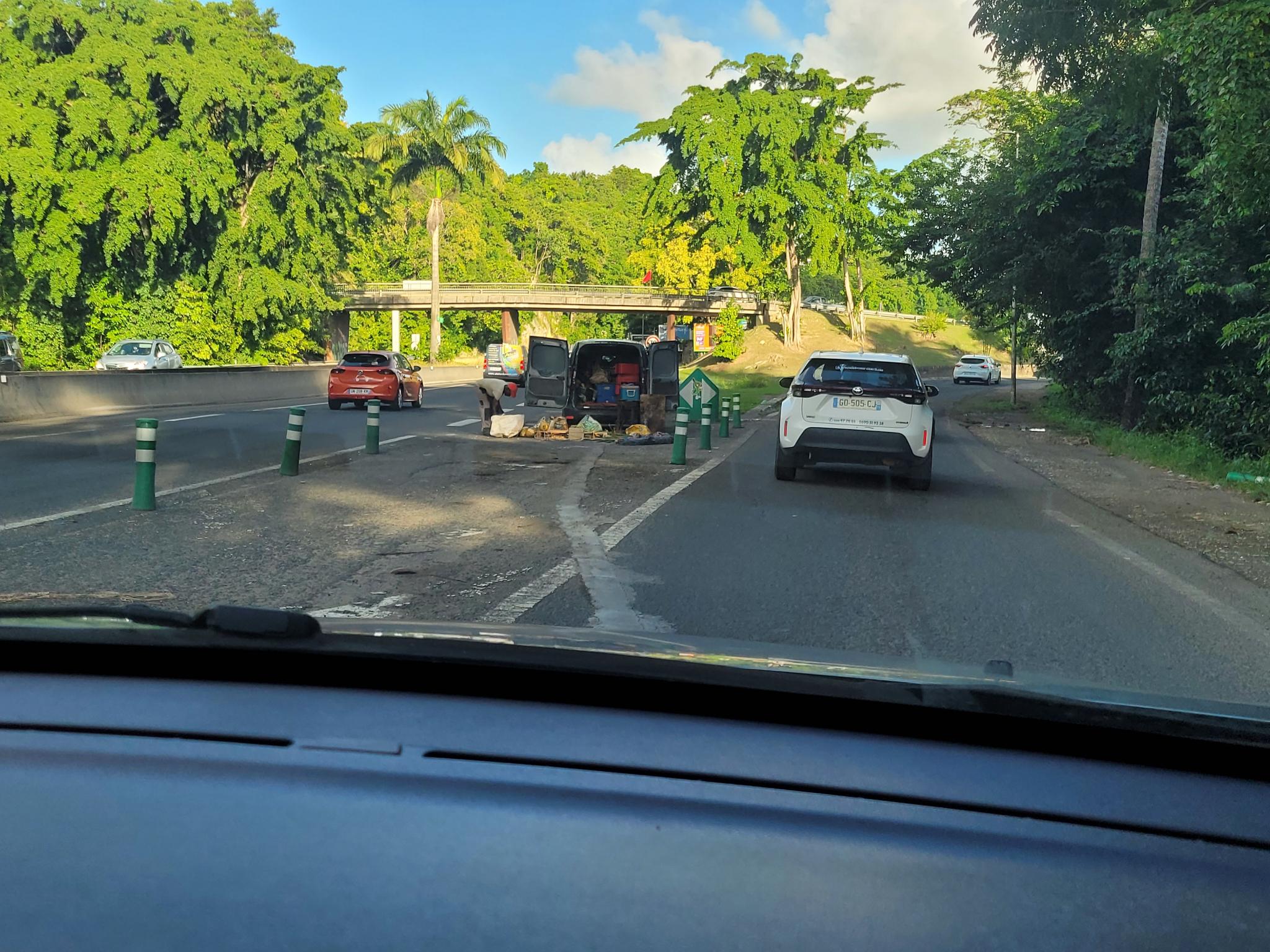 Lädeli und Restaurants gibt es dafür an allen möglichen Ecken. Bei der Autobahnausfahrt kann man z.B. frisches Kokosnusswasser kaufen. Oder dann gibt es den Caribgrill: viel Fleisch, viele Plastikstühle, viel Qualm, eher nicht so anmächelig - haben wir ausgelassen. Neben den grossen Einkaufszentren (siehe hier) gibt es auch noch den Discounter, den Leader Price :o).